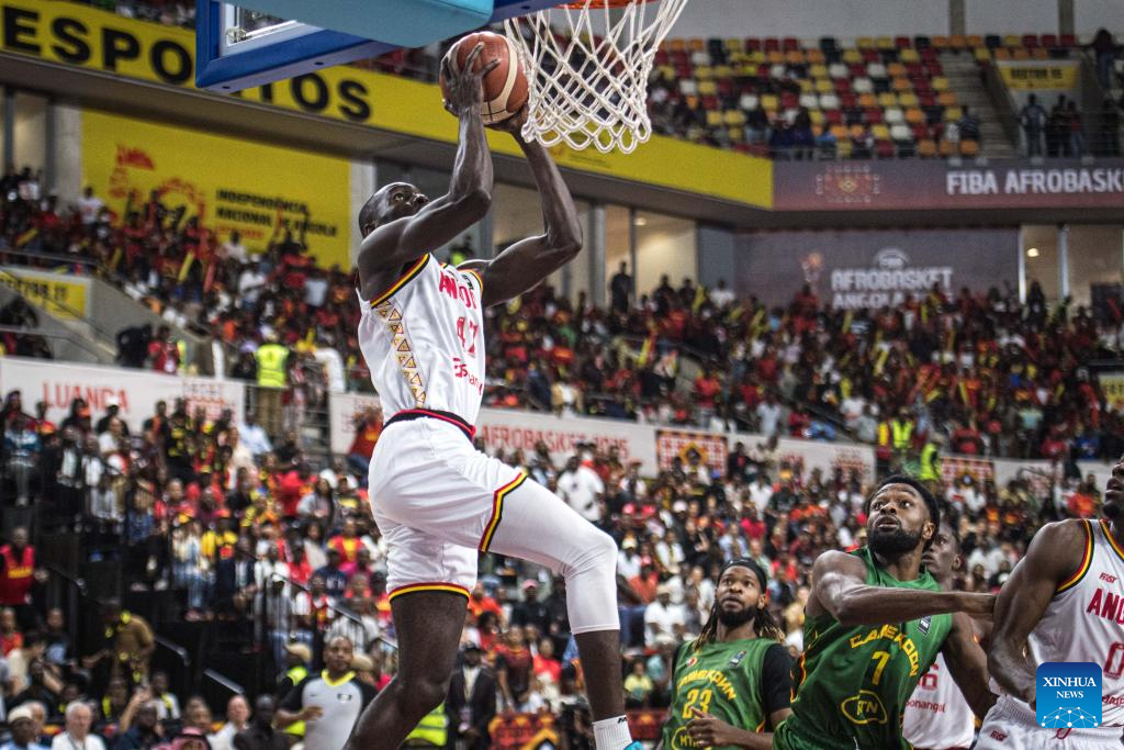 Angola's Milton Bande Valente (L) throws down an alley-oop during the semifinal between Angola and Cameroon at the 2025 FIBA AfroBasket in Luanda, Angola, Aug. 23, 2025. (Xinhua/Wang Guansen)