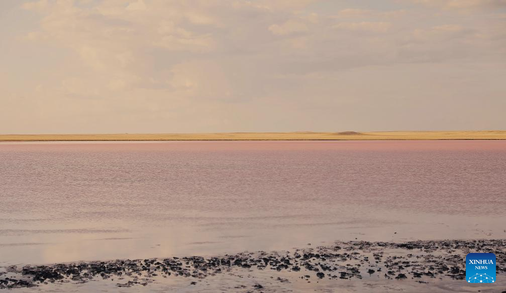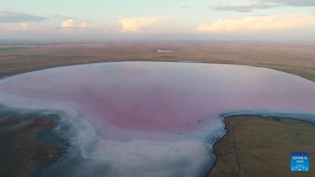 This photo taken on Aug. 23, 2025 shows the view of Kobeytuz Lake in Akmola Region, Kazakhstan. Kobeytuz Lake is renowned for its pink hues. Due to limited tourism capacity and environmental concerns, Kobeytuz Lake was closed to the public after 2020 for ecological restoration. According to Kazinform News Agency, the lake has reopened to visitors starting from the summer of 2025. (Photo by Kalizhan Ospanov/Xinhua)
