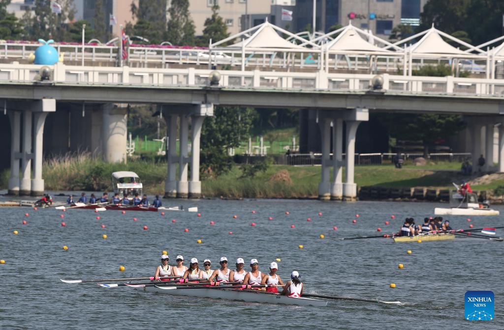 Participants take part in a women's rowing competition on the Taehwa River in Ulsan, South Korea, Aug. 24, 2025. Teams of students from universities including Peking University, Oxford University, the University of Tokyo, and Yale University participated in the 2025 Ulsan World-Class University Rowing Festival held in Ulsan, South Korea from August 23 to 24. (Xinhua/Yao Qilin)
