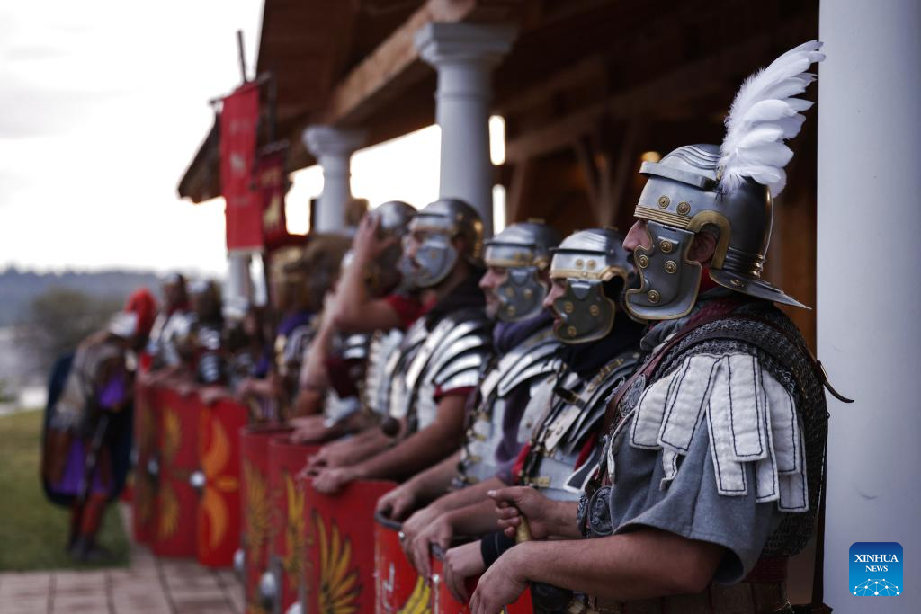 Participants dressed as Roman soldiers wait to present military skills during the Roman Games Festival in Ptuj, Slovenia, Aug. 23, 2025. The 18th edition of the Roman Games festival kicked off on Friday in Ptuj and will last till Aug. 24. (Photo by Zeljko Stevanic/Xinhua)