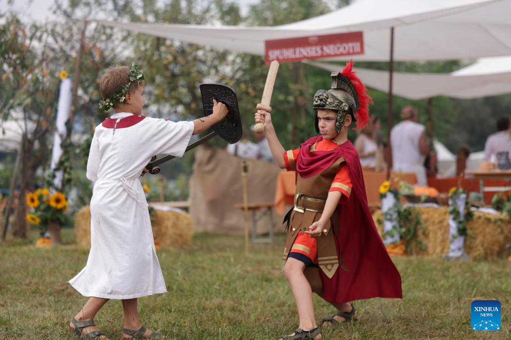 Boys dressed in Roman costumes play during the Roman Games Festival in Ptuj, Slovenia, Aug. 23, 2025. The 18th edition of the Roman Games festival kicked off on Friday in Ptuj and will last till Aug. 24. (Photo by Zeljko Stevanic/Xinhua)