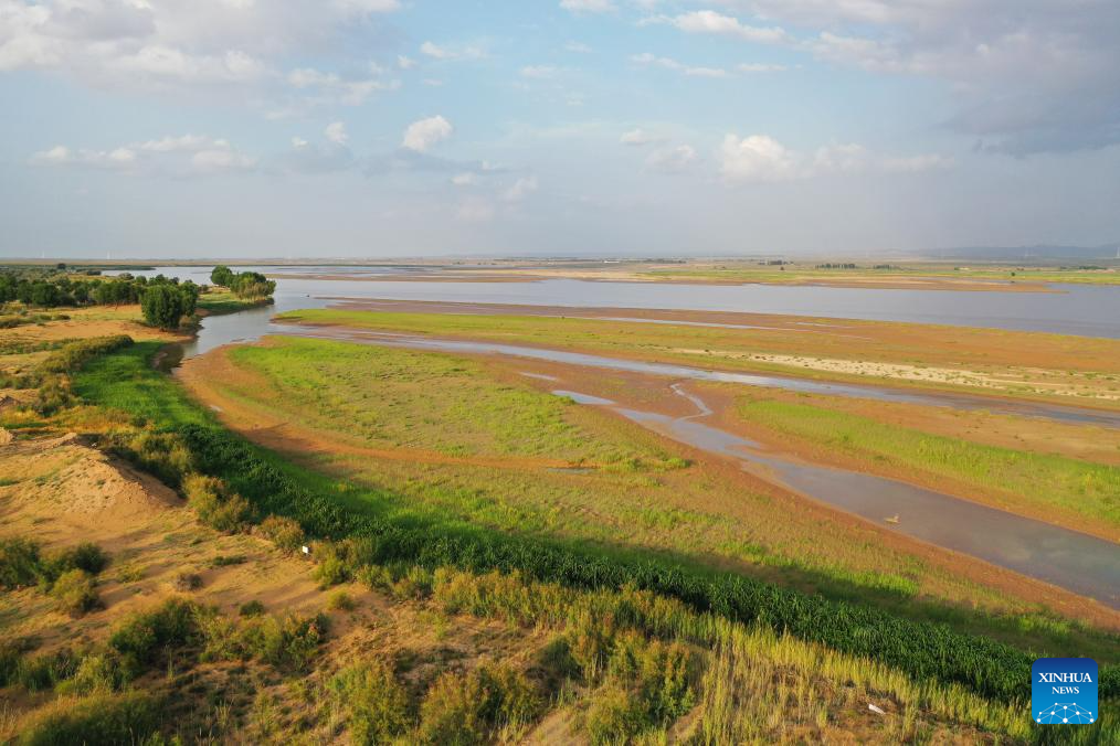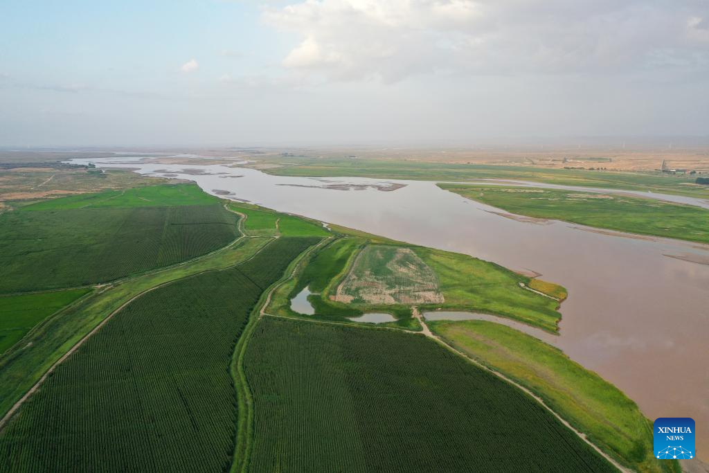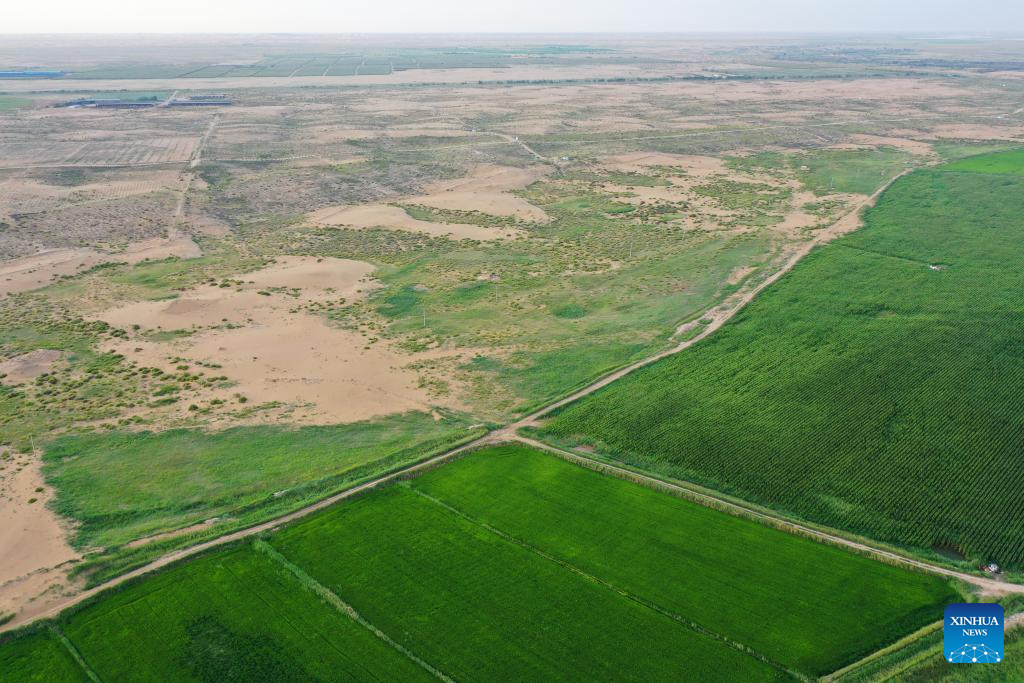 This aerial drone photo taken on Aug. 1, 2025 shows an area of an ecological restoration project in Alxa League, north China's Inner Mongolia Autonomous Region. In recent years, Alxa has been promoting the construction of an ecological restoration project to prevent sand from flowing into the Ulan Buh section of the Yellow River in Alxa League. The project, covering an area of 11,000 mu (733.3 hectares), plays a vital role in soil and water conservation and ecological restoration along the Yellow River. (Xinhua/Li Zhipeng)