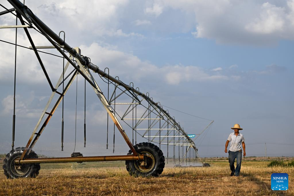 A worker checks sprinkler irrigation equipment in an area of an ecological restoration project in Alxa League, north China's Inner Mongolia Autonomous Region, Aug. 1, 2025. In recent years, Alxa has been promoting the construction of an ecological restoration project to prevent sand from flowing into the Ulan Buh section of the Yellow River in Alxa League. The project, covering an area of 11,000 mu (733.3 hectares), plays a vital role in soil and water conservation and ecological restoration along the Yellow River. (Xinhua/Li Zhipeng)