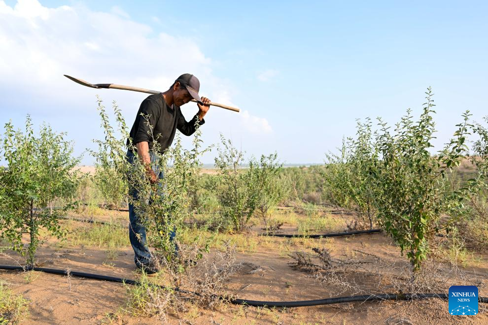 A worker checks the growth of saplings in an area of an ecological restoration project in Alxa League, north China's Inner Mongolia Autonomous Region, Aug. 1, 2025. In recent years, Alxa has been promoting the construction of an ecological restoration project to prevent sand from flowing into the Ulan Buh section of the Yellow River in Alxa League. The project, covering an area of 11,000 mu (733.3 hectares), plays a vital role in soil and water conservation and ecological restoration along the Yellow River. (Xinhua/Li Zhipeng)