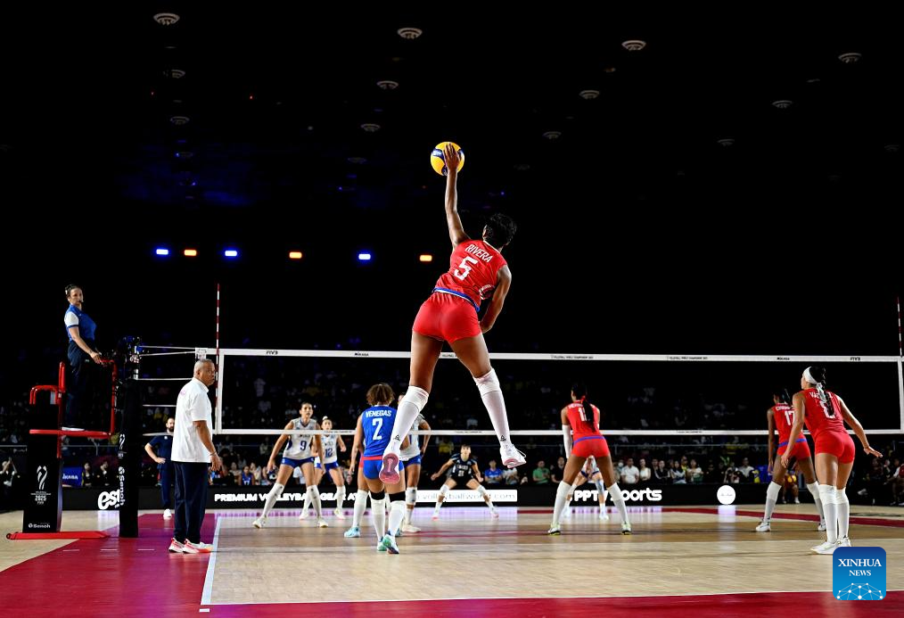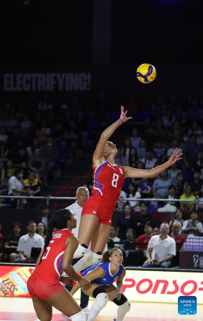Valeria Vazquez Gomez (top) of Puerto Rico competes during the Preliminary Phase Pool C match between Puerto Rico and Greece at the Volleyball Women's World Championship in Chiang Mai, Thailand, Aug. 24, 2025. (Xinhua/Sun Weitong)