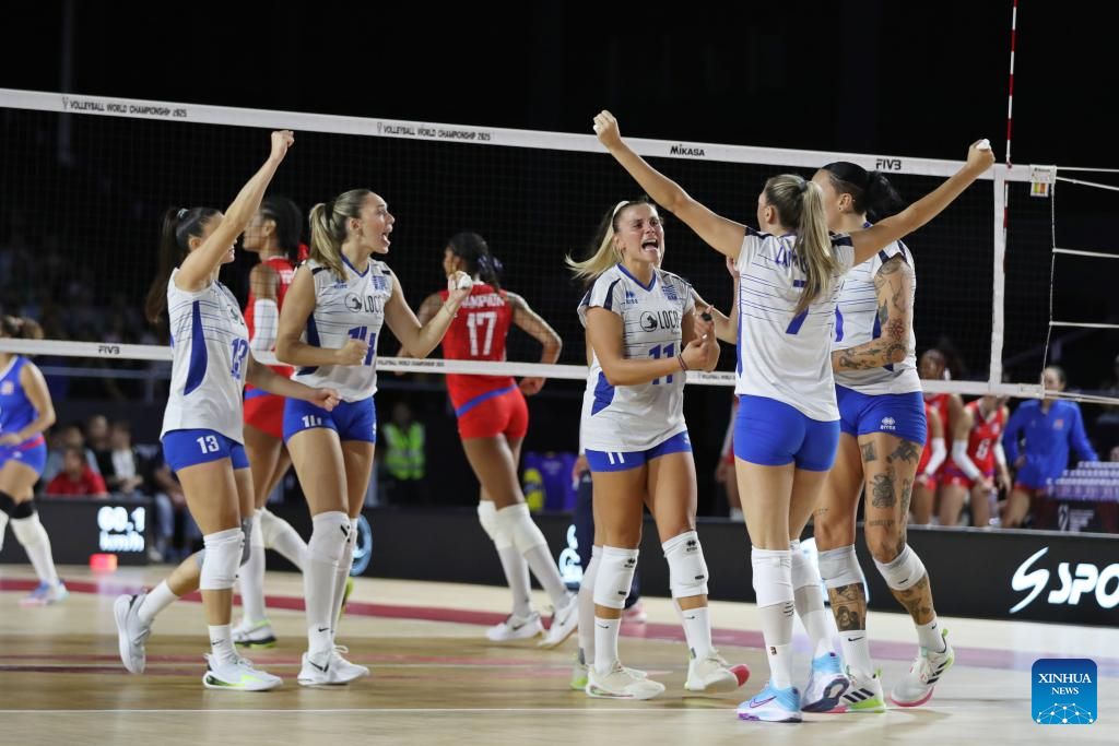 Players of Greece celebrate victory after the Preliminary Phase Pool C match between Puerto Rico and Greece at the Volleyball Women's World Championship in Chiang Mai, Thailand, Aug. 24, 2025. (Xinhua/Hou Zhaokang)