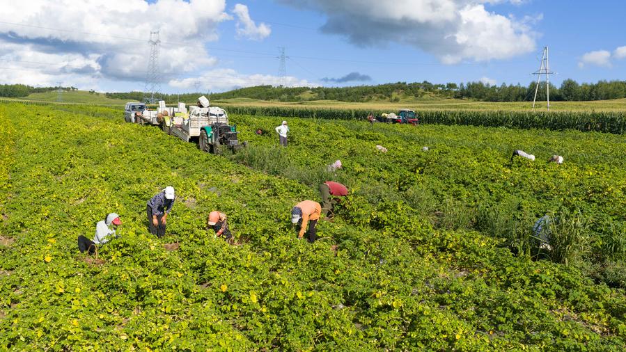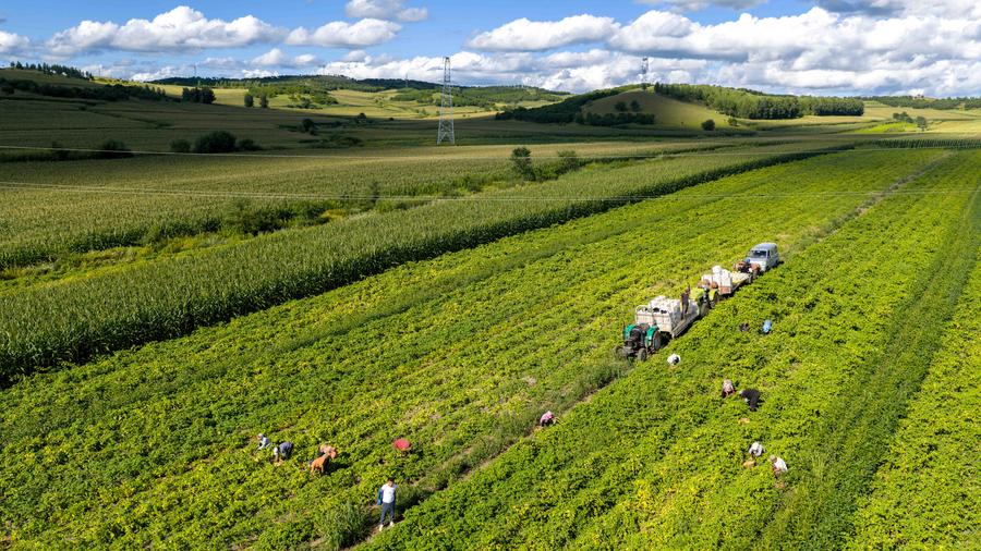 An aerial drone photo taken on Aug. 24, 2025 shows villagers picking golden berries at a field in Morin Dawa Daur Autonomous Banner of Hulun Buir, north China's Inner Mongolia Autonomous Region. (Xinhua/Ma Jinrui)