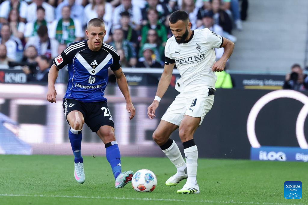 Franck Honorat (L) of Borussia Moenchengladbach vies with Nicolas Capaldo (R) of Hamburger SV during the first division of Bundesliga football match between Borussia Moenchengladbach and Hamburger SV in Moenchengladbach, Germany, Aug. 24, 2025. (Photo by Joachim Bywaletz/Xinhua)
