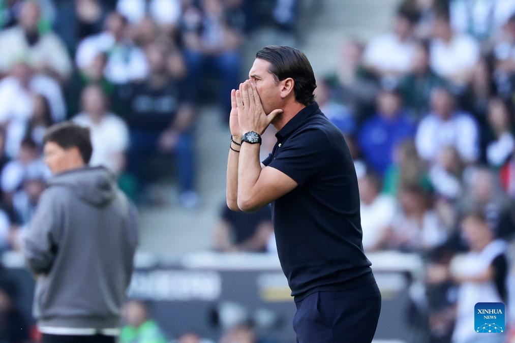 Gerardo Seoanem, head coach of Borussia Moenchengladbach, instructs during the first division of Bundesliga football match between Borussia Moenchengladbach and Hamburger SV in Moenchengladbach, Germany, Aug. 24, 2025. (Photo by Joachim Bywaletz/Xinhua)