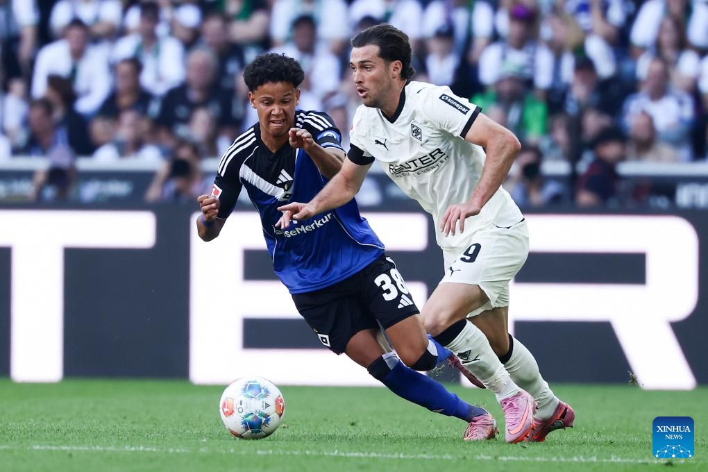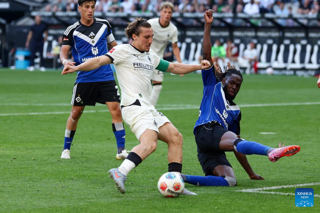 Rocco Reitz (L) of Borussia Moenchengladbach vies with Jordan Torunarigha of Hamburger SV during the first division of Bundesliga football match between Borussia Moenchengladbach and Hamburger SV in Moenchengladbach, Germany, Aug. 24, 2025. (Photo by Joachim Bywaletz/Xinhua)
