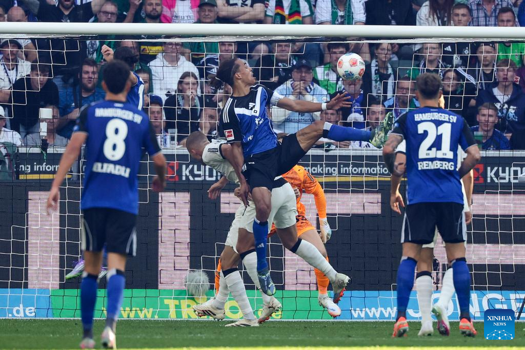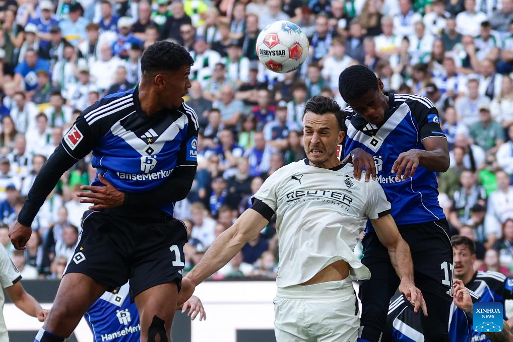 Haris Tabakovic (C) of Borussia Moenchengladbach heads for the ball with Ransford Konigsdorffer (L) and Warmed Omari of Hamburger SV during the first division of Bundesliga football match between Borussia Moenchengladbach and Hamburger SV in Moenchengladbach, Germany, Aug. 24, 2025. (Photo by Joachim Bywaletz/Xinhua)