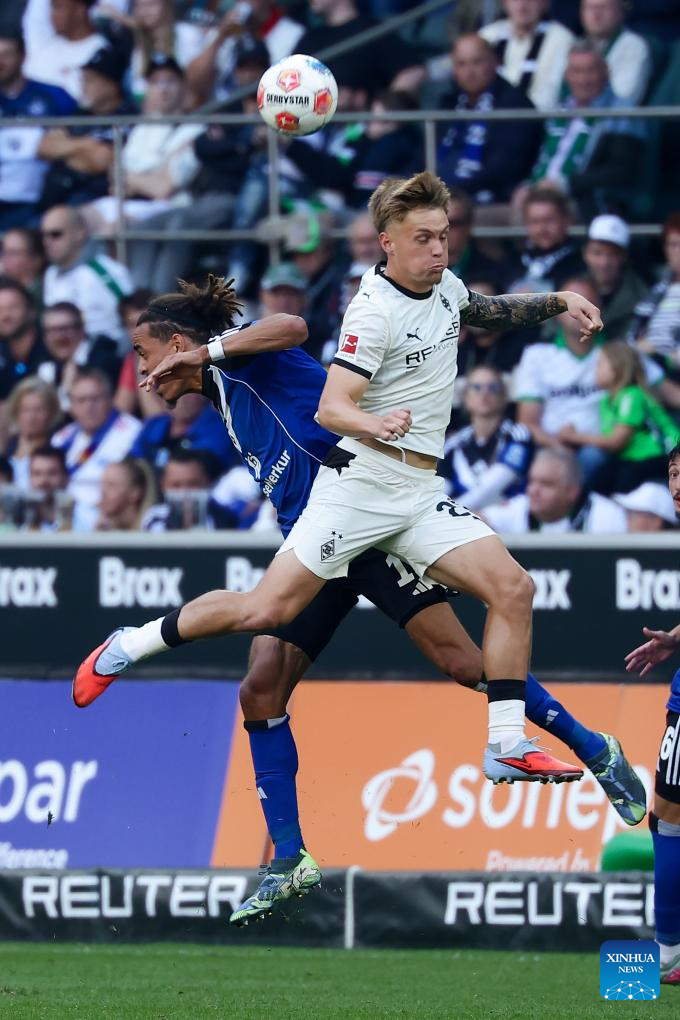 Nico Elvedi (2nd L) of Borussia Moenchengladbach and Yussuf Poulsen (3rd L) of Hamburger SV head for the ball during the first division of Bundesliga football match between Borussia Moenchengladbach and Hamburger SV in Moenchengladbach, Germany, Aug. 24, 2025. (Photo by Joachim Bywaletz/Xinhua)