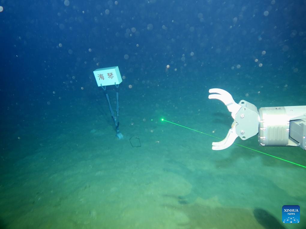 China's self-developed Haiqin, a 6,000-meter deep-sea remotely operated vehicle (ROV), places a marker on the seafloor at a depth of 4,140 meters, in the South China Sea, Aug. 23, 2025.