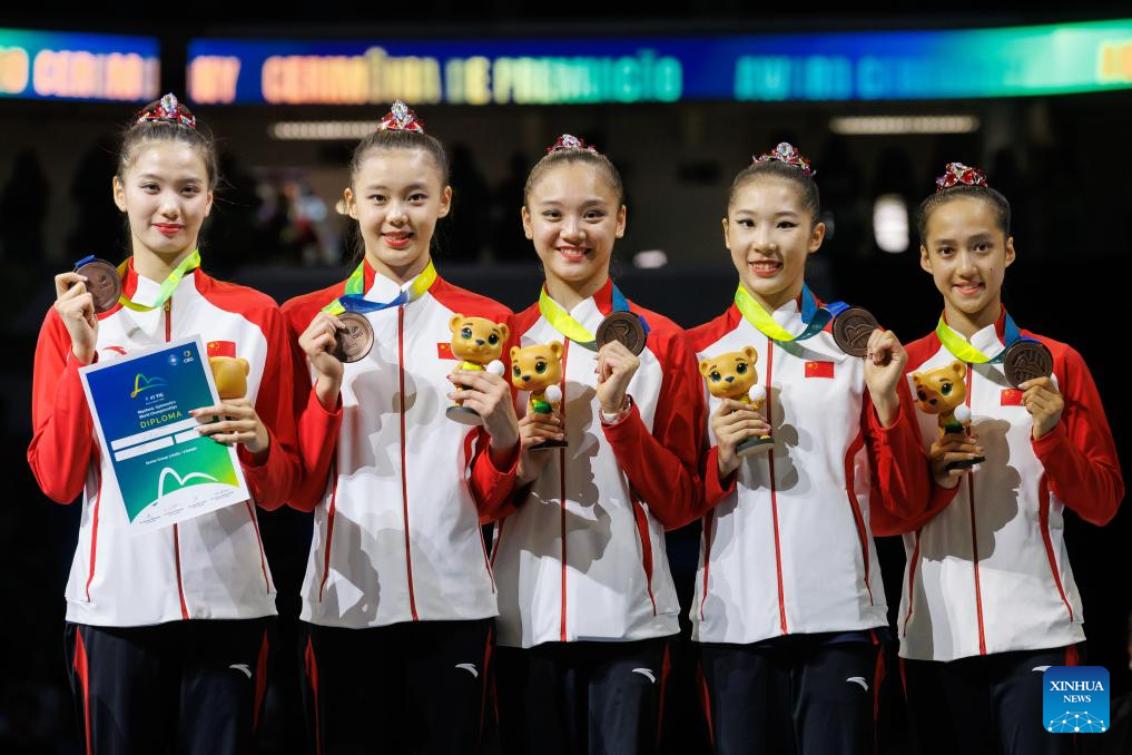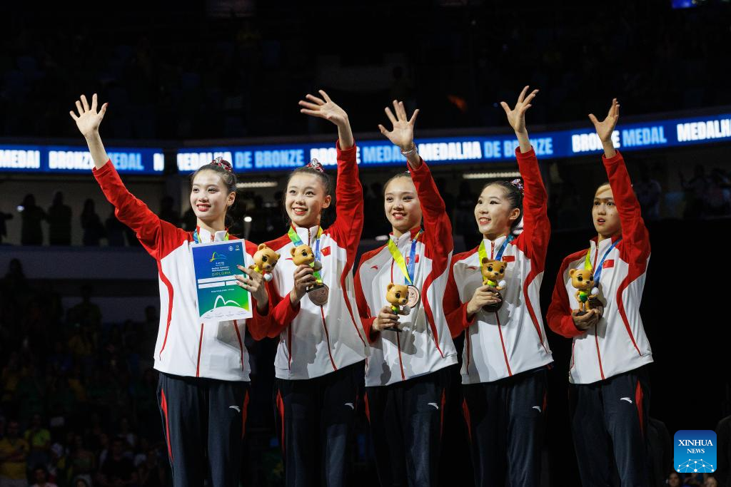 Bronze medalists team China pose with their medals during the awarding ceremony for the group 3 balls and 2 hoops final at the 41st FIG Rhythmic Gymnastics World Championships in Rio de Janeiro, Brazil, on Aug. 24, 2025. (Photo by Claudia Martini/Xinhua)