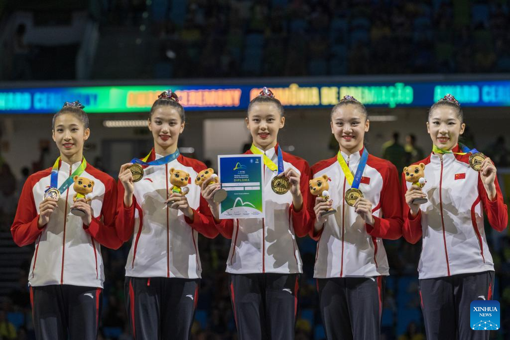 Gold medalists team China pose with their medals during the awarding ceremony for the group 5 ribbons final at the 41st FIG Rhythmic Gymnastics World Championships in Rio de Janeiro, Brazil, on Aug. 24, 2025. (Photo by Claudia Martini/Xinhua)