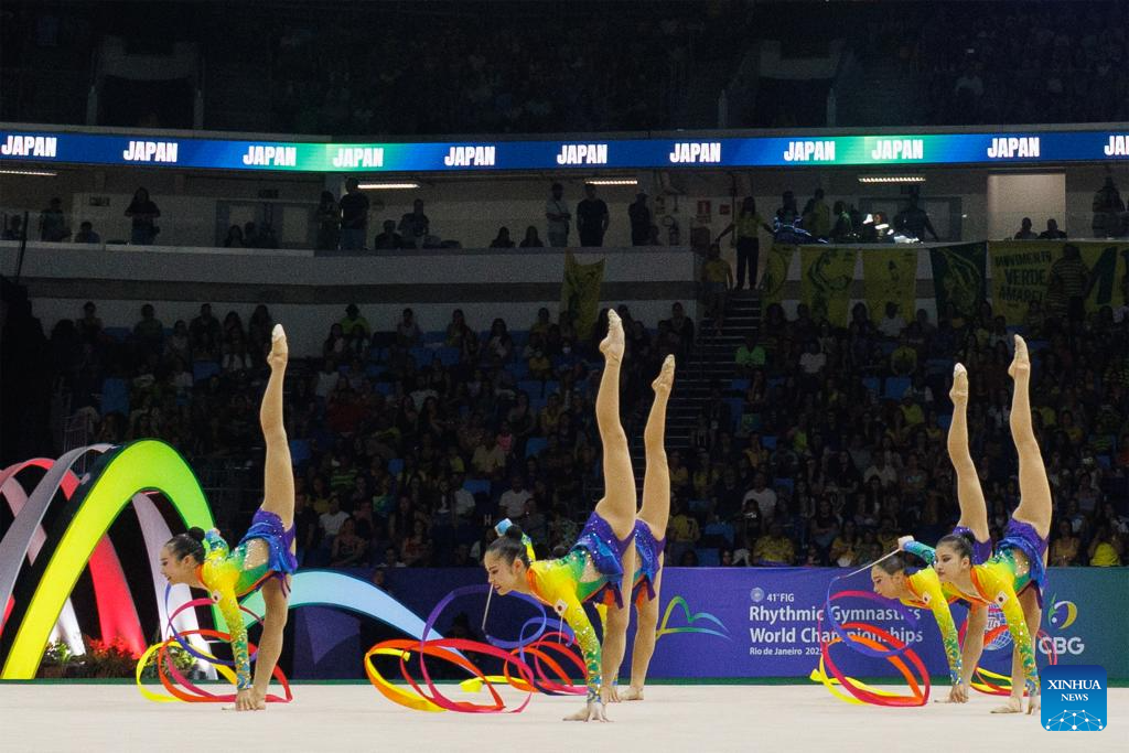 Team Japan perform during the group 5 ribbons final at the 41st FIG Rhythmic Gymnastics World Championships in Rio de Janeiro, Brazil, on Aug. 24, 2025. (Photo by Claudia Martini/Xinhua)