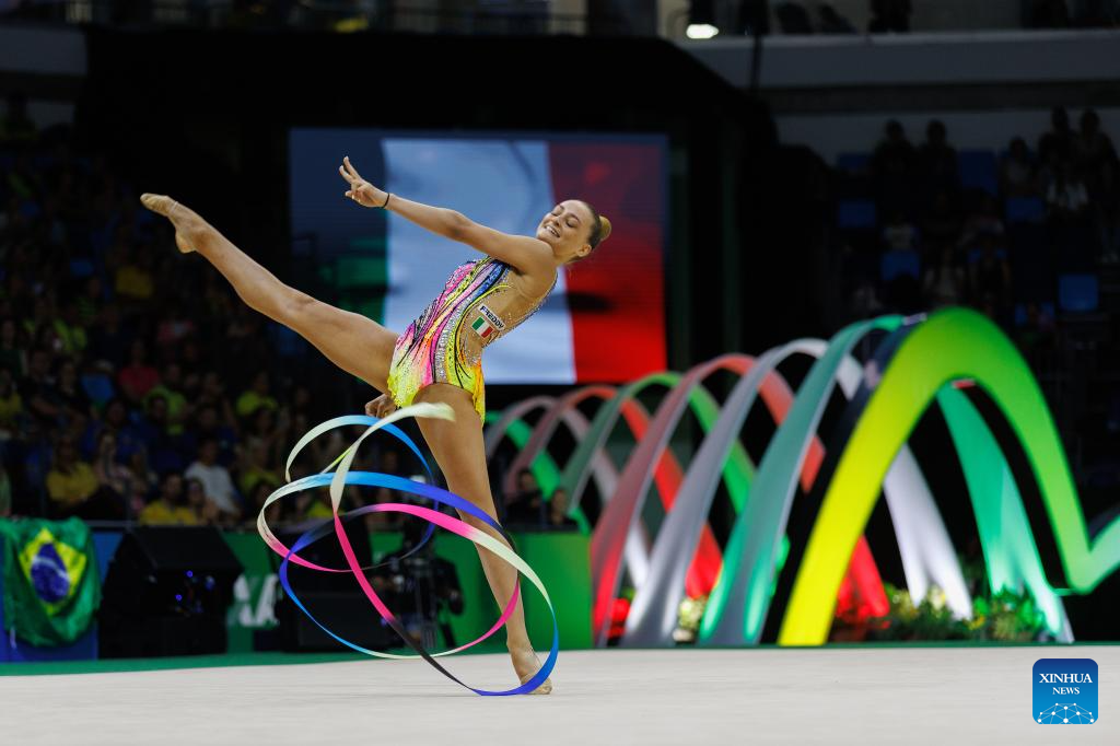 Tara Dragas of Italy competes during in the individual ribbon final during the 41st FIG Rhythmic Gymnastics World Championships in Rio de Janeiro, Brazil, on Aug. 24, 2025. (Photo by Claudia Martini/Xinhua)