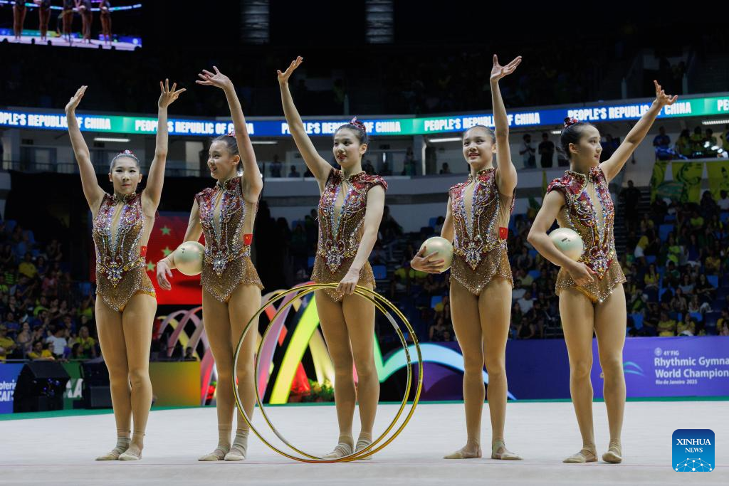 Team China perform during the group 5 ribbons final at the 41st FIG Rhythmic Gymnastics World Championships in Rio de Janeiro, Brazil, on Aug. 24, 2025. (Photo by Claudia Martini/Xinhua)