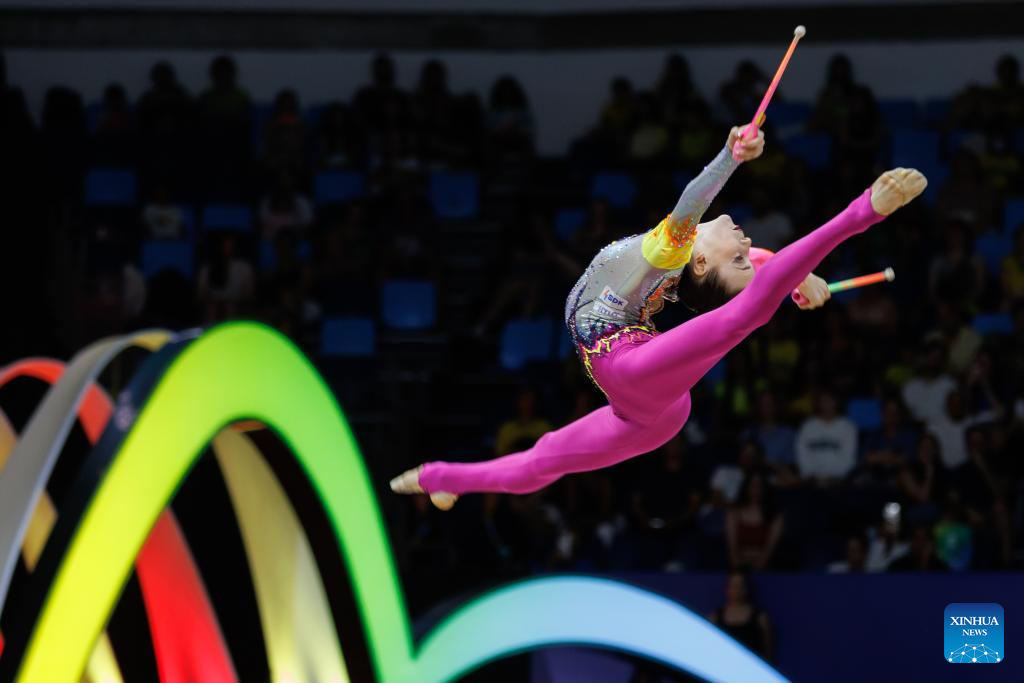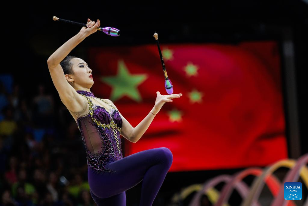 Wang Zilu of China competes during the individual clubs final at the 41st FIG Rhythmic Gymnastics World Championships in Rio de Janeiro, Brazil, on Aug. 24, 2025. (Photo by Claudia Martini/Xinhua)