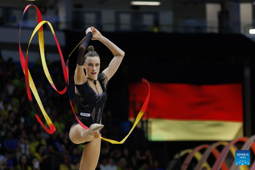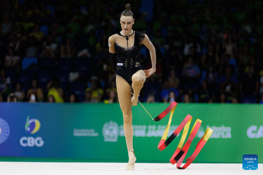 Darja Varfolomeev of Germany competes during in the individual ribbon final during the 41st FIG Rhythmic Gymnastics World Championships in Rio de Janeiro, Brazil, on Aug. 24, 2025. (Photo by Claudia Martini/Xinhua)