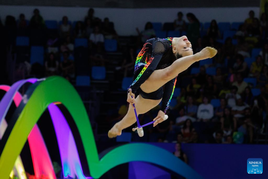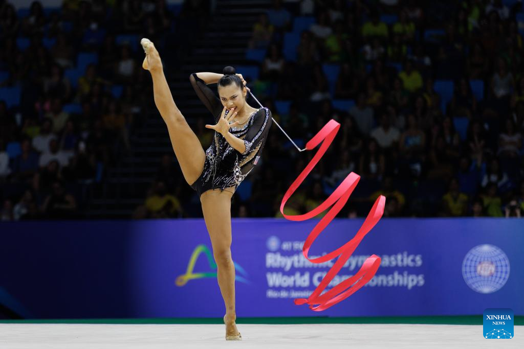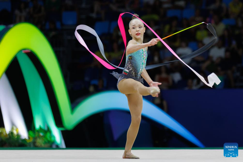 Stiliana Nikolova of Bulgaria competes during in the individual ribbon final during the 41st FIG Rhythmic Gymnastics World Championships in Rio de Janeiro, Brazil, on Aug. 24, 2025. (Photo by Claudia Martini/Xinhua)