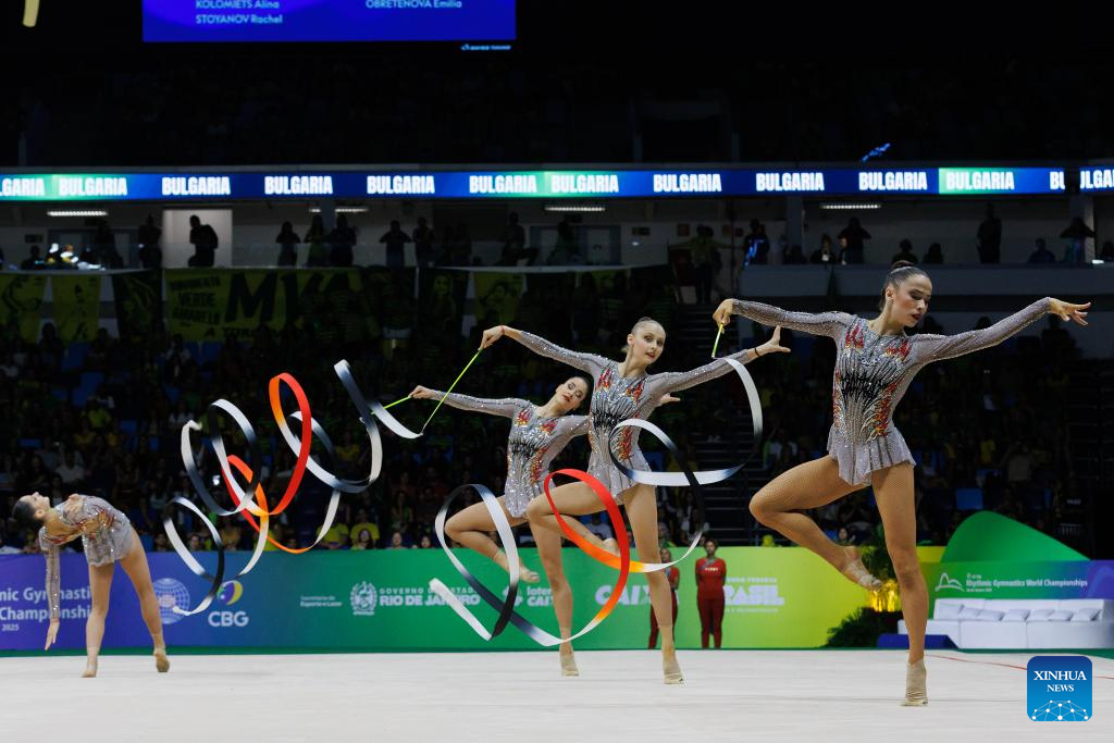 Team Bulgaria perform during the group 5 ribbons final at the 41st FIG Rhythmic Gymnastics World Championships in Rio de Janeiro, Brazil, on Aug. 24, 2025. (Photo by Claudia Martini/Xinhua)