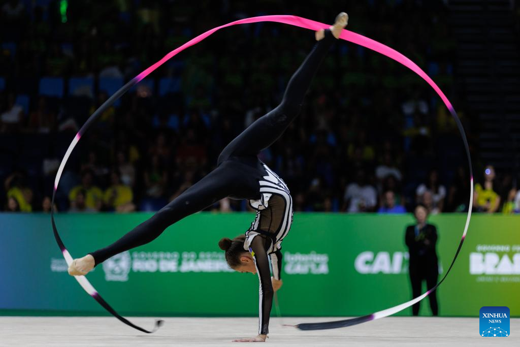 Taisiia Onofriichuk of Ukraine competes during in the individual ribbon final during the 41st FIG Rhythmic Gymnastics World Championships in Rio de Janeiro, Brazil, on Aug. 24, 2025. (Photo by Claudia Martini/Xinhua)