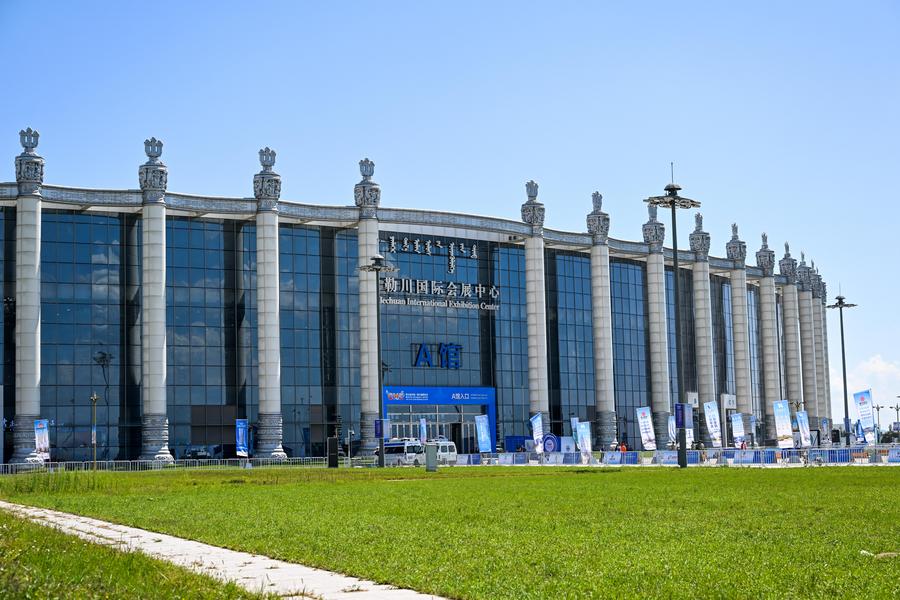 This photo taken on Aug. 25, 2025 shows a scene at the opening ceremony of the 5th China-Mongolia Expo in Hohhot, north China's Inner Mongolia Autonomous Region. (Xinhua/Li Zhipeng)
