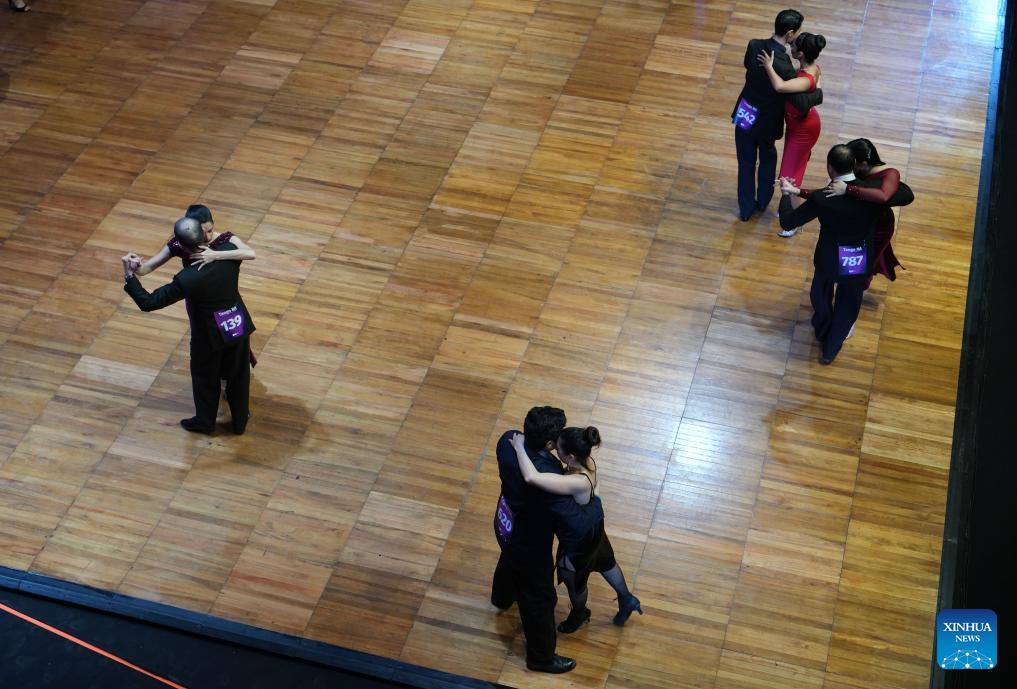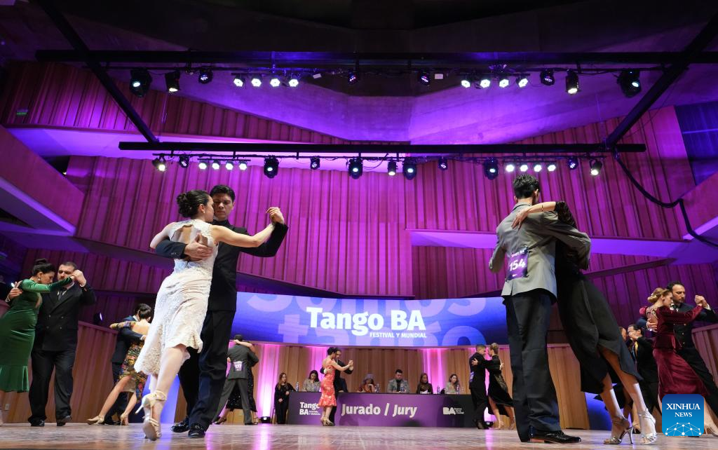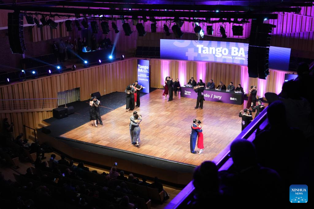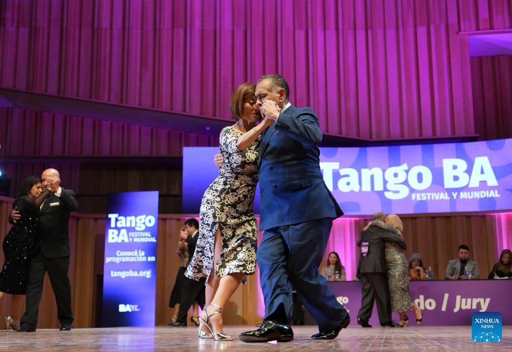 Dancers perform during a competition of the Tango Festival in Buenos Aires, Argentina, Aug. 24, 2025. (Xinhua/Zhang Duo)