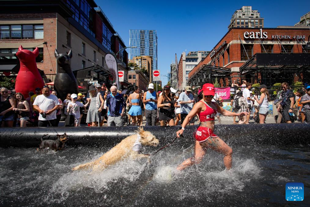 A dog splashes through a pool while running during the "Pet-A-Palooza" event in Vancouver, British Columbia, Canada, Aug. 24, 2025. "Pet-A-Palooza," also known as the Day of the Dog, is an annual summer celebration for local pups and their owners. The event offered a variety of dog-related activities and entertainment, attracting thousands of dog owners and their furry companions. (Photo by Liang Sen/Xinhua)