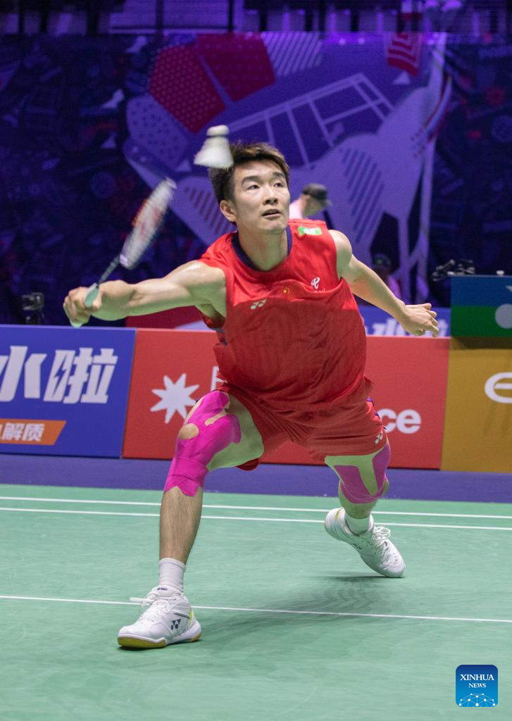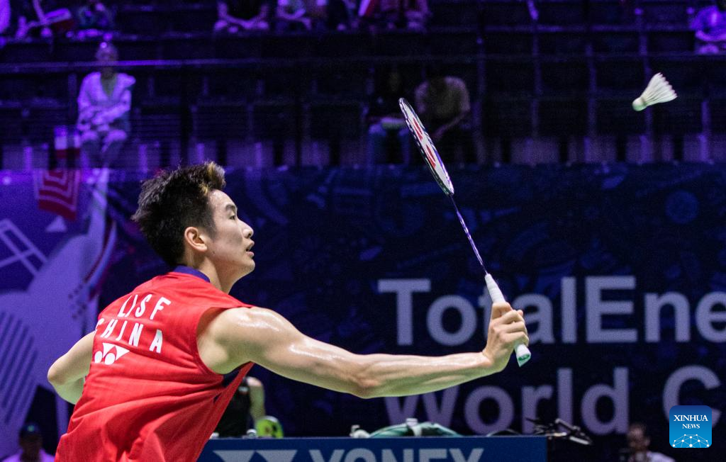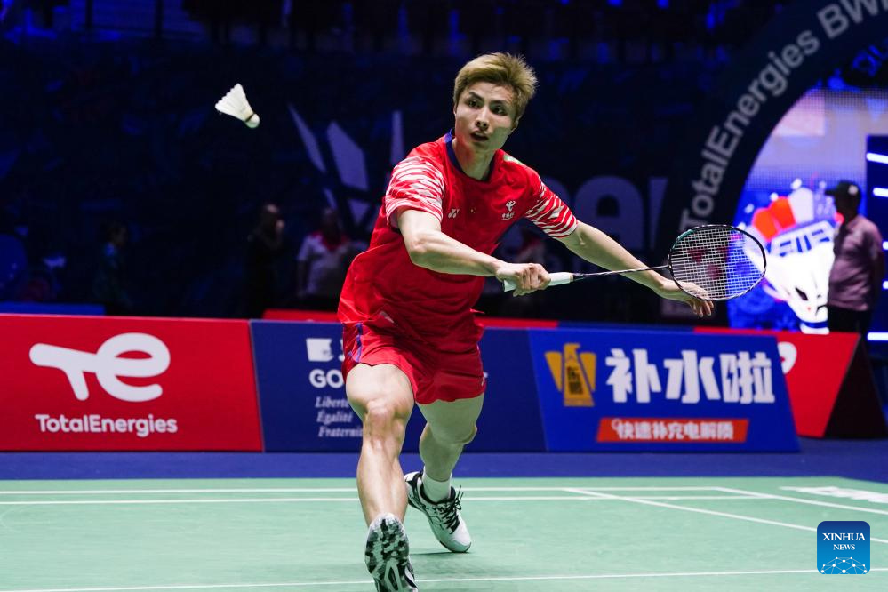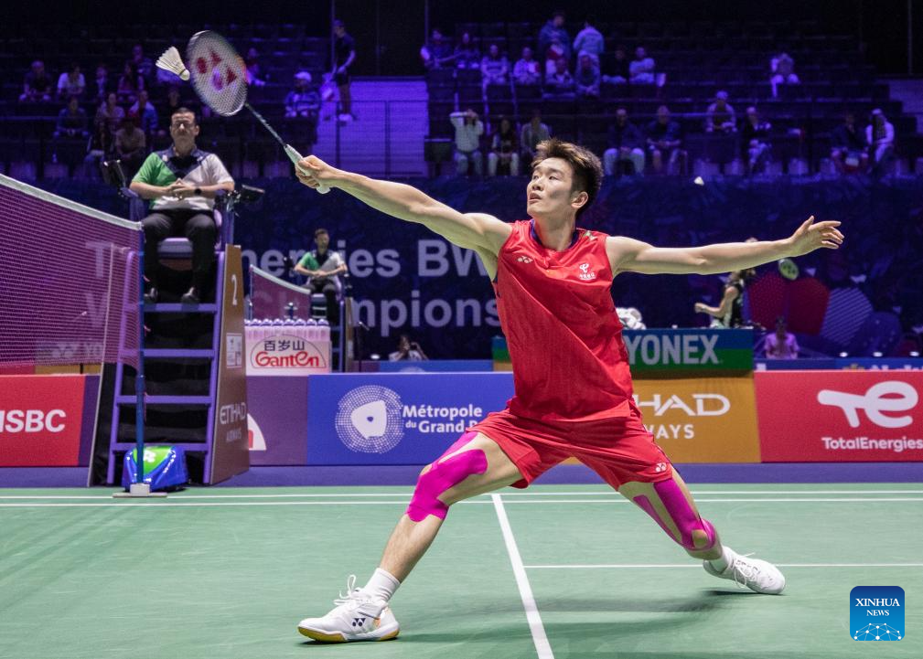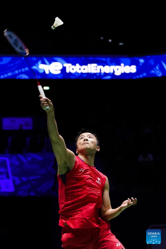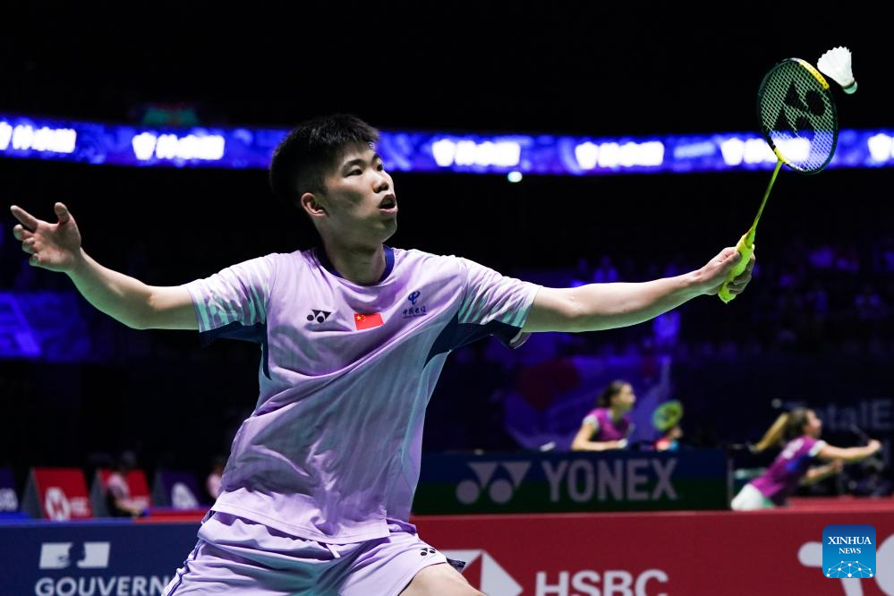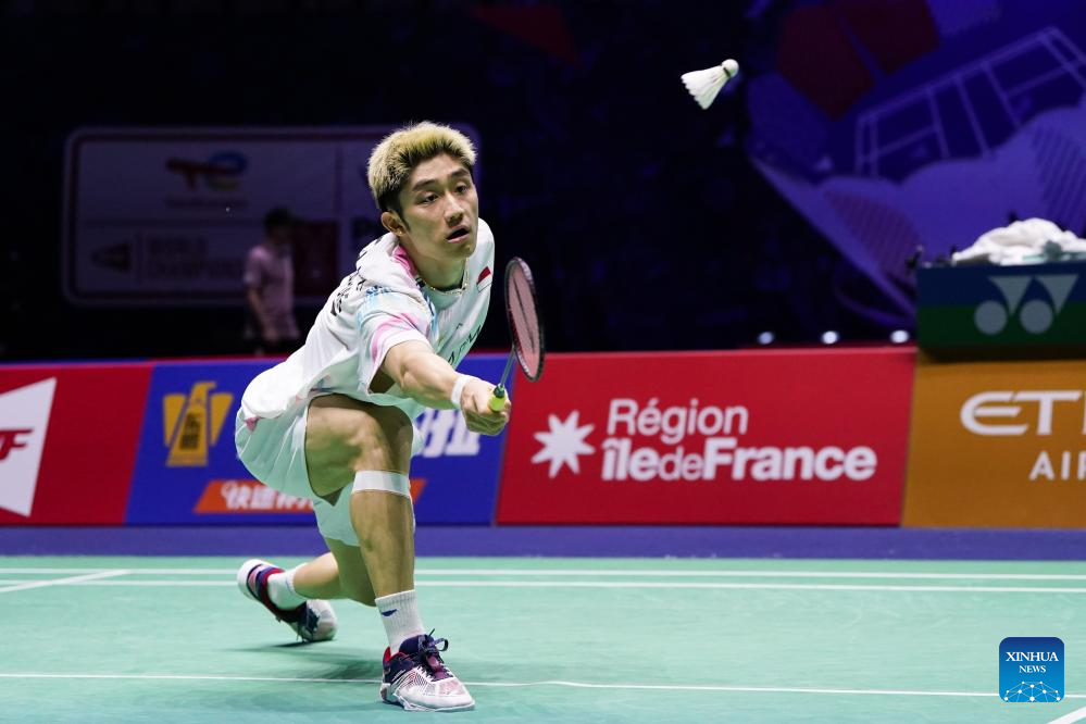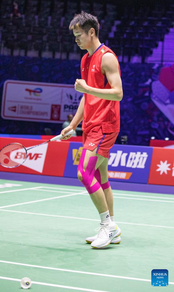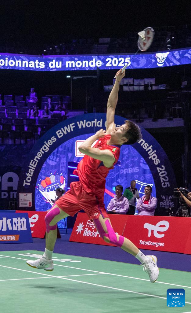 Shi Yuqi competes during the men's singles first round match between Shi Yuqi of China and Lakshya Sen of India at the BWF World Championships 2025 in Paris, France, Aug. 25, 2025. (Xinhua/Peng Ziyang)