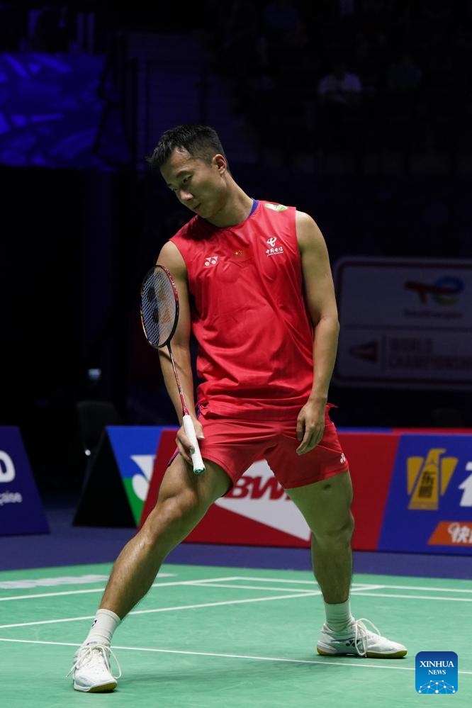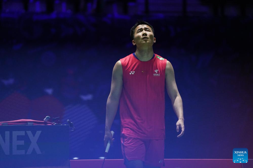 Shi Yuqi reacts during the men's singles first round match between Shi Yuqi of China and Lakshya Sen of India at the BWF World Championships 2025 in Paris, France, Aug. 25, 2025. (Xinhua/Peng Ziyang)