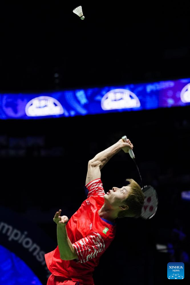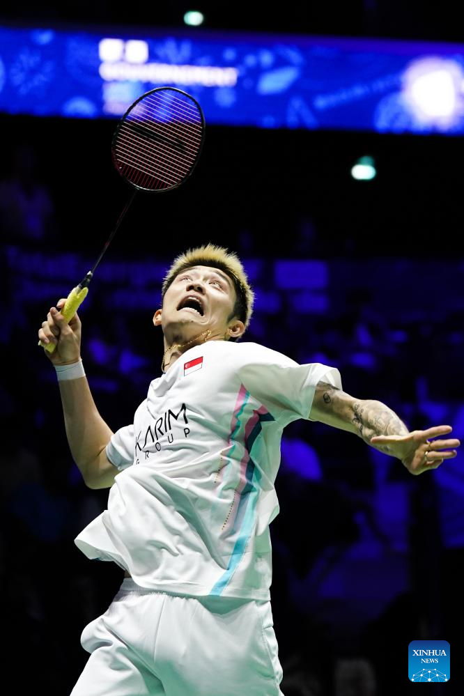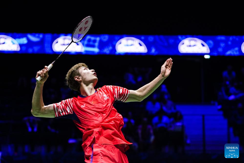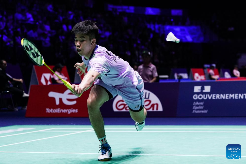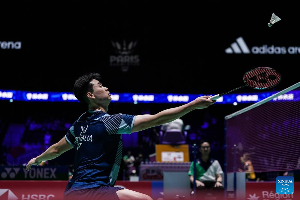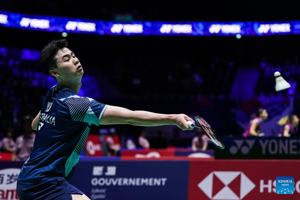 Lu Guangzu competes during the men's singles first round match between Lu Guangzu of China and Jia Heng Jason Teh of Singapore at the BWF World Championships 2025 in Paris, France, Aug. 25, 2025. (Xinhua/Peng Ziyang)
