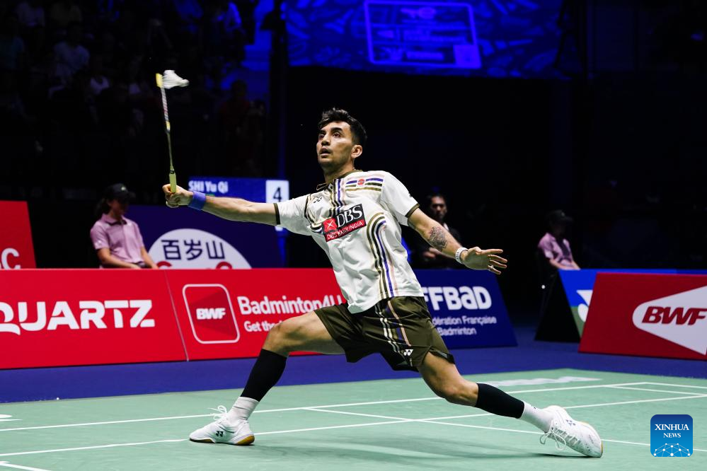 Lakshya Sen competes during the men's singles first round match between Shi Yuqi of China and Lakshya Sen of India at the BWF World Championships 2025 in Paris, France, Aug. 25, 2025. (Xinhua/Peng Ziyang)