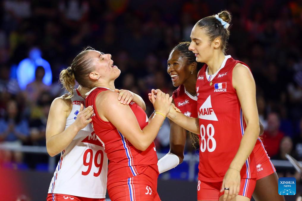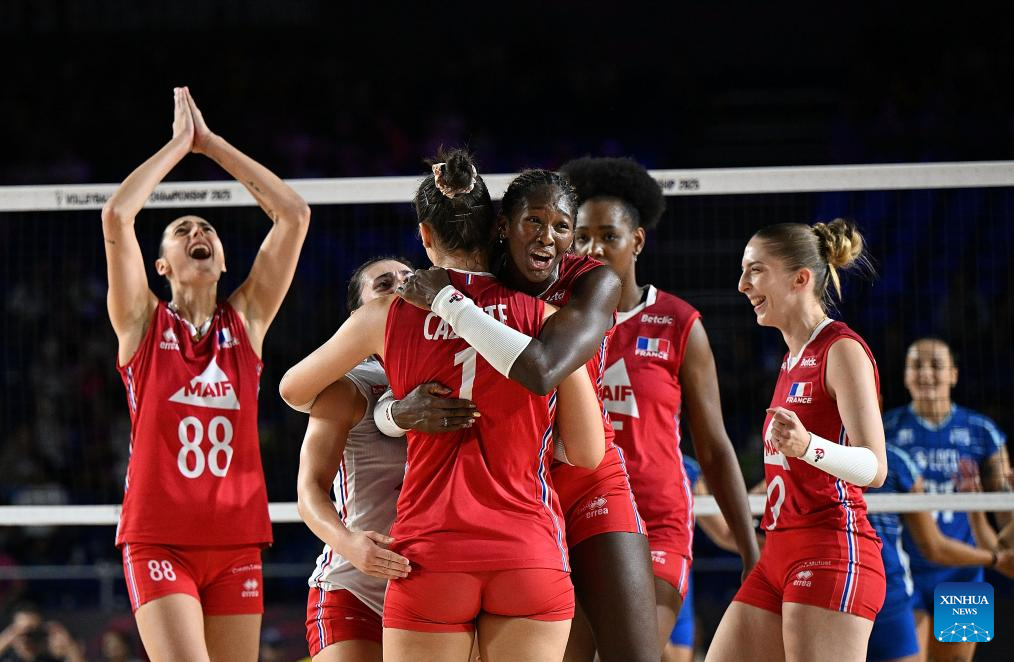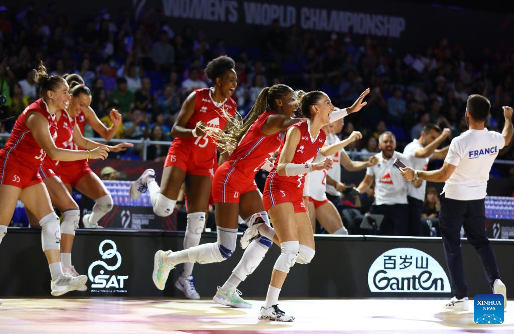 Players of France celebrate scoring during the Preliminary Phase Pool C match between France and Greece at the Volleyball Women's World Championship in Chiang Mai, Thailand, Aug. 26, 2025. (Xinhua/Hou Zhaokang)