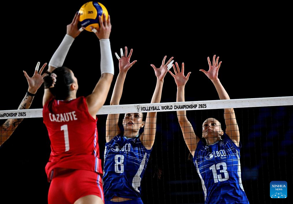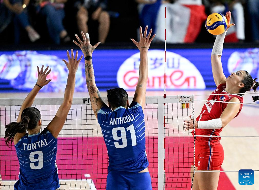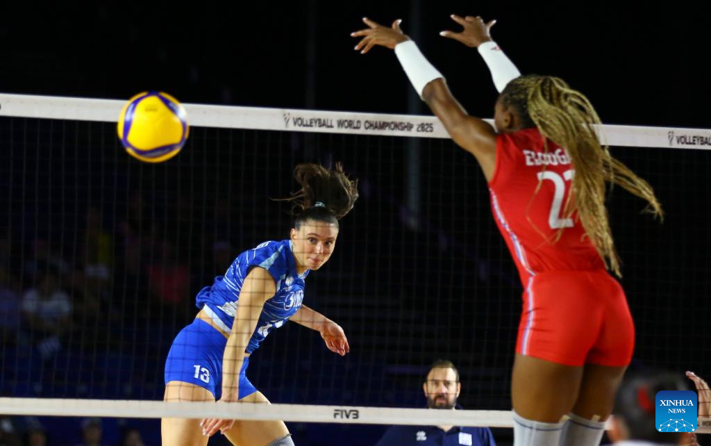 Martha Evdokia Anthouli (L) of Greece competes during the Preliminary Phase Pool C match between France and Greece at the Volleyball Women's World Championship in Chiang Mai, Thailand, Aug. 26, 2025. (Xinhua/Sun Weitong)