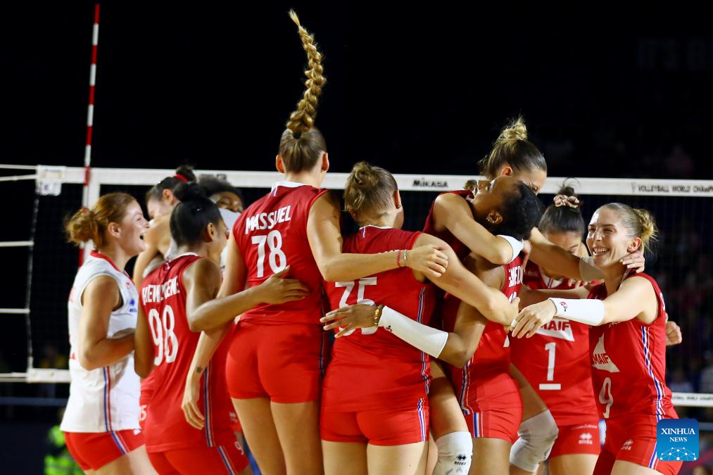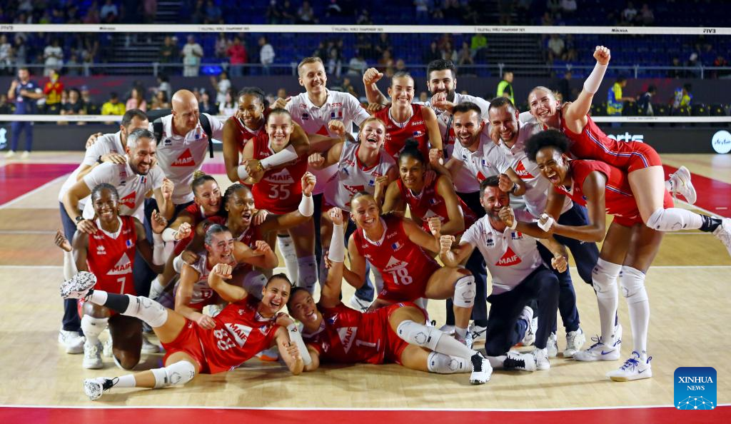 Players of France celebrate after winning the Preliminary Phase Pool C match between France and Greece at the Volleyball Women's World Championship in Chiang Mai, Thailand, Aug. 26, 2025. (Xinhua/Sun Weitong)