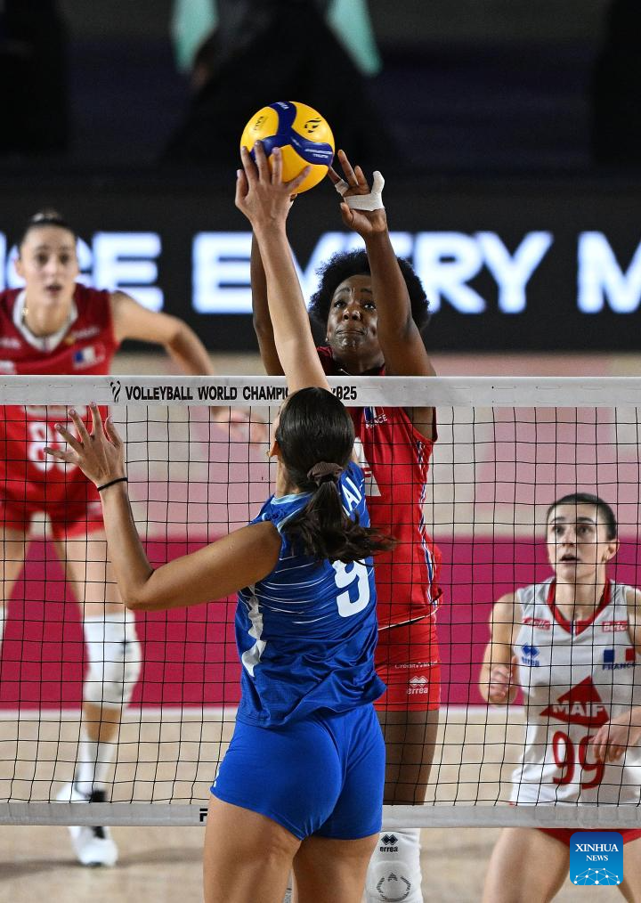 Amelie Rotar (L) of France spikes the ball during the Preliminary Phase Pool C match between France and Greece at the Volleyball Women's World Championship in Chiang Mai, Thailand, Aug. 26, 2025. (Xinhua/Hou Zhaokang)