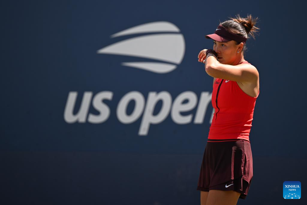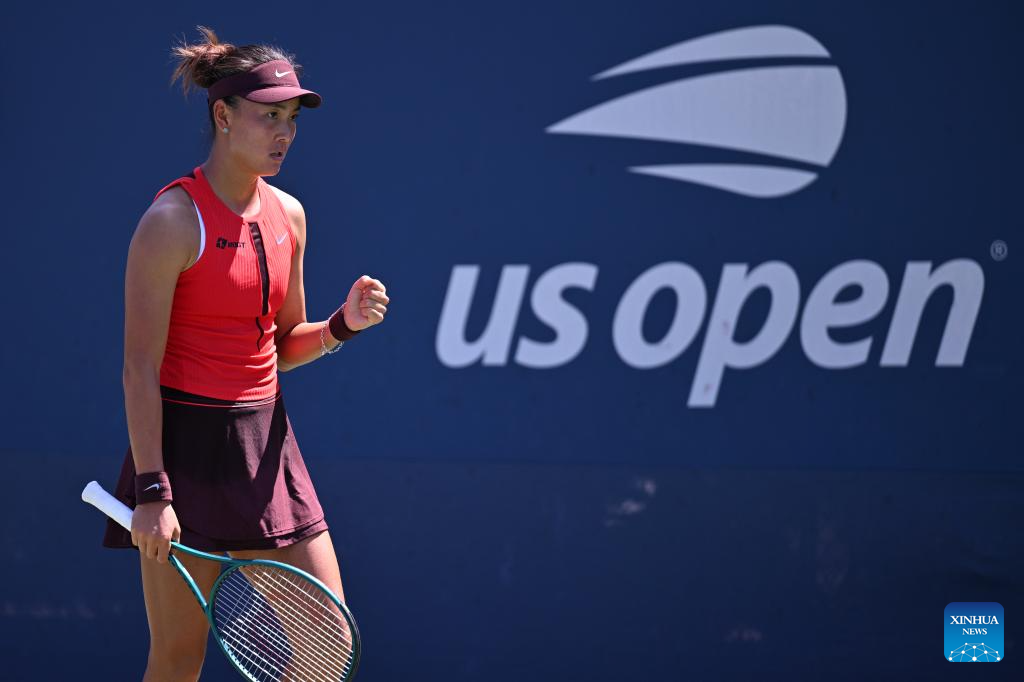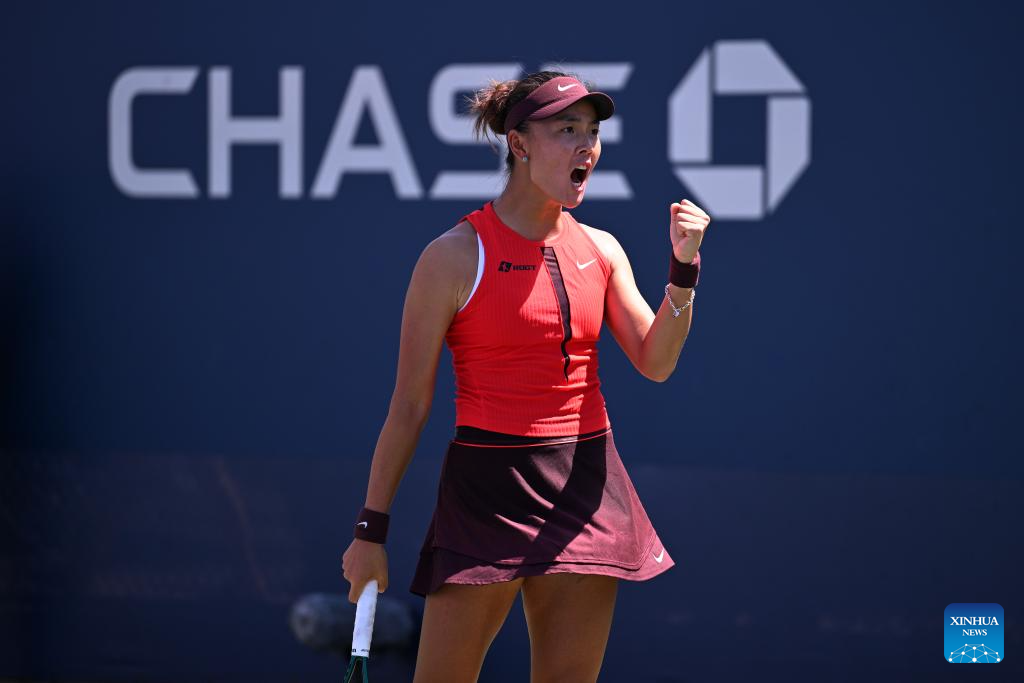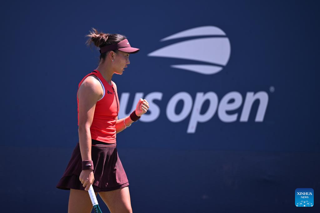 Yuan Yue of China reacts during the women's singles first round match against Liudmila Samsonova of Russia at the 2025 US Open tennis championships in New York, the United States, on Aug. 25, 2025. (Xinhua/Li Rui)
