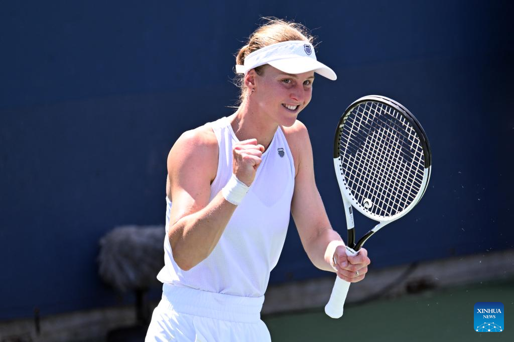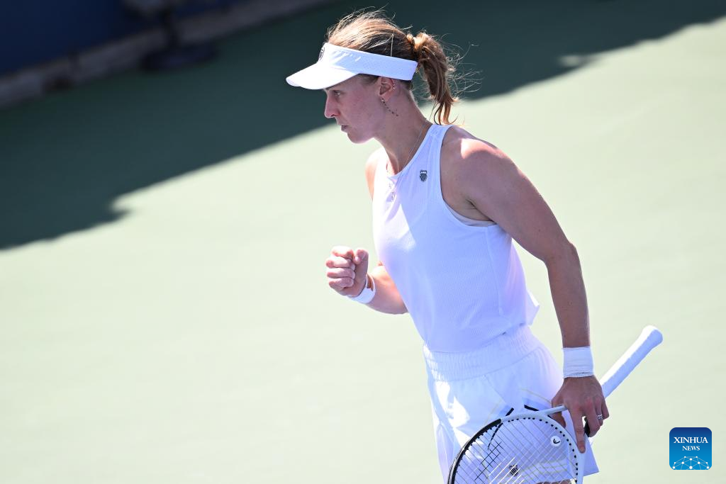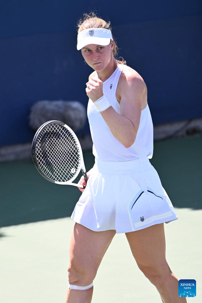Liudmila Samsonova of Russia reacts during the women's singles first round match against Yuan Yue of China at the 2025 US Open tennis championships in New York, the United States, on Aug. 25, 2025. (Xinhua/Li Rui)