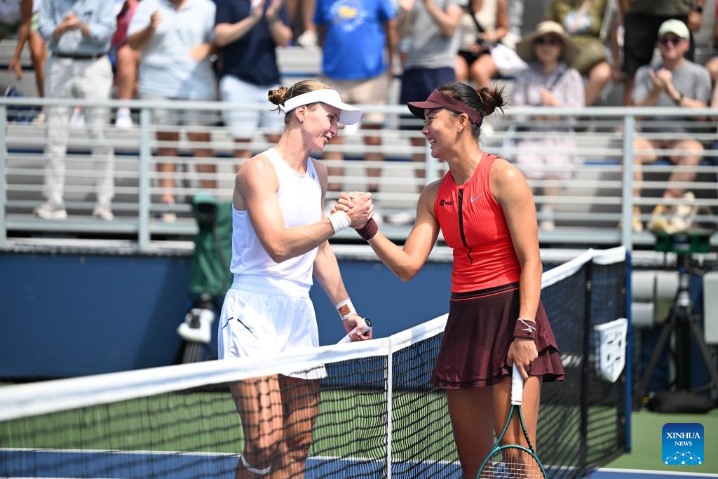 Yuan Yue (R) of China shakes hands with Liudmila Samsonova of Russia after their women's singles first round match at the 2025 US Open tennis championships in New York, the United States, on Aug. 25, 2025. (Xinhua/Li Rui)