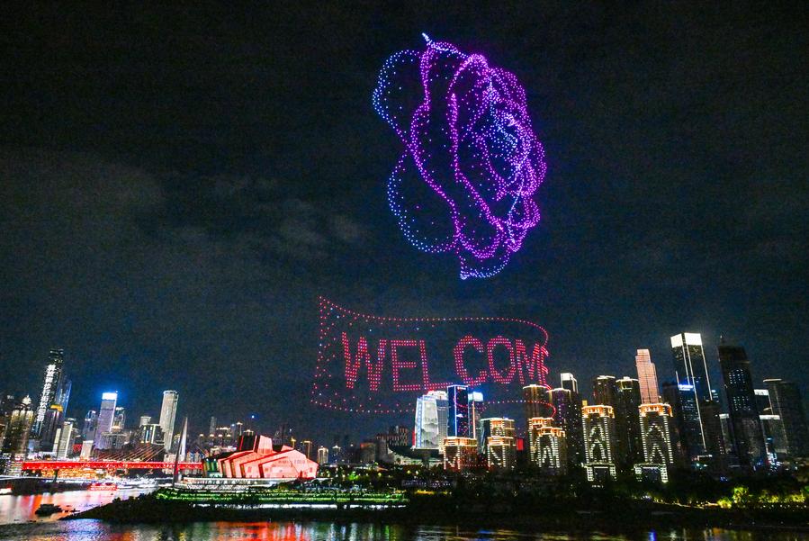 CHONGQING, Aug. 26 (Xinhua) -- A skyscraper-sized basketball made of 5,000 drones lit up the night sky of southwest China's Chongqing Municipality, then morphed into NBA star Stephen Curry's signature "night-night" gesture with the words "Curry meets Chongqing."