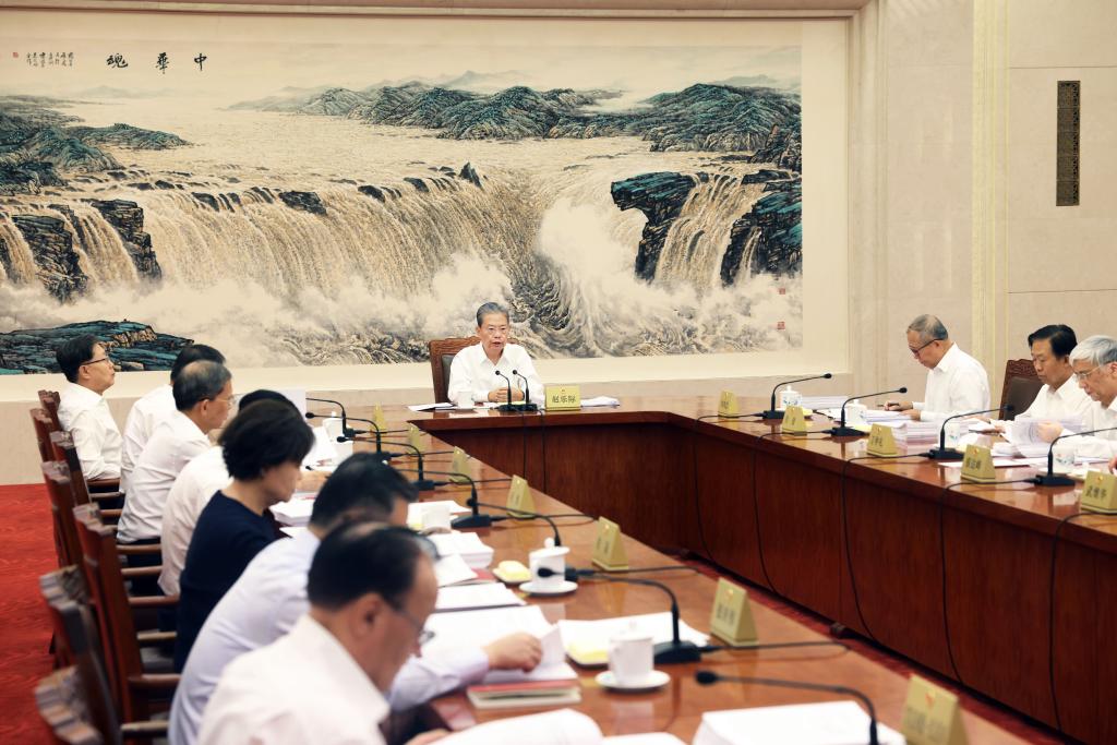 Zhao Leji, chairman of the National People's Congress (NPC) Standing Committee, presides over the 48th meeting of the Council of Chairpersons of the 14th NPC Standing Committee at the Great Hall of the People in Beijing, capital of China, Aug. 26, 2025. (Xinhua/Liu Weibing)
