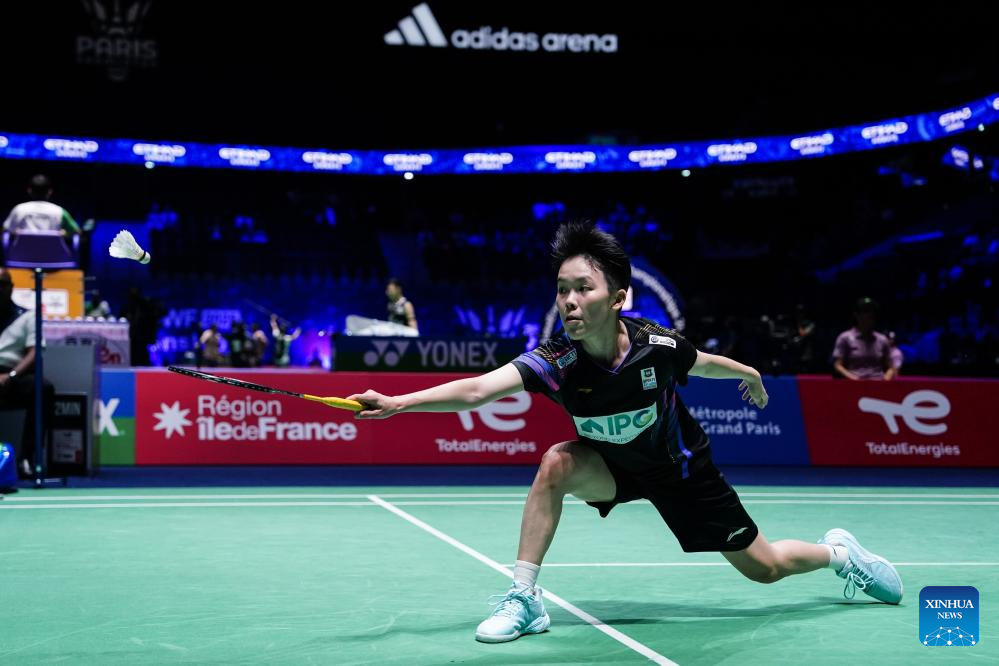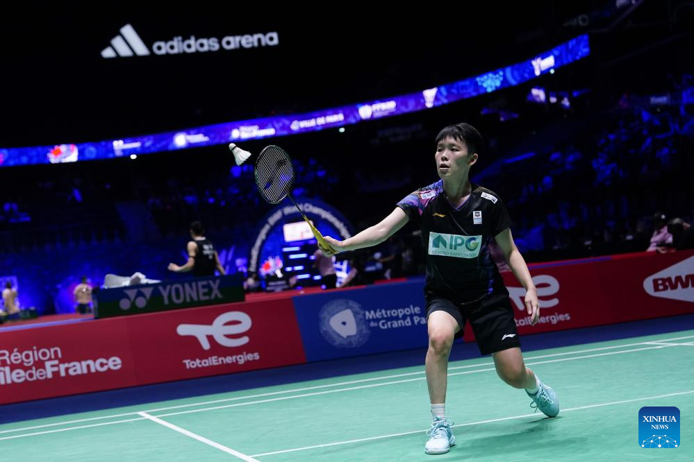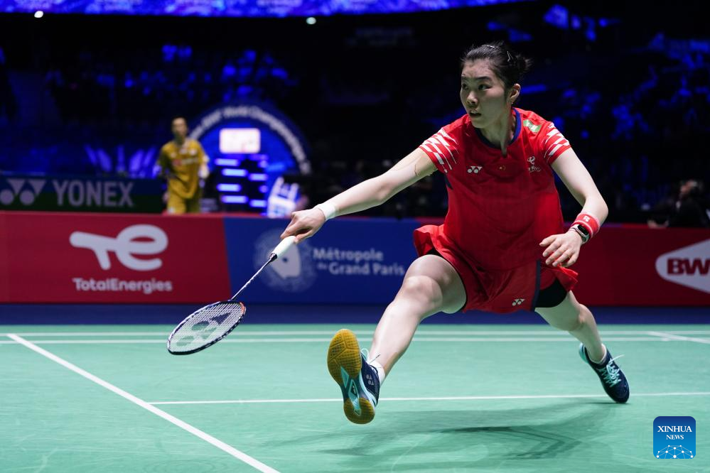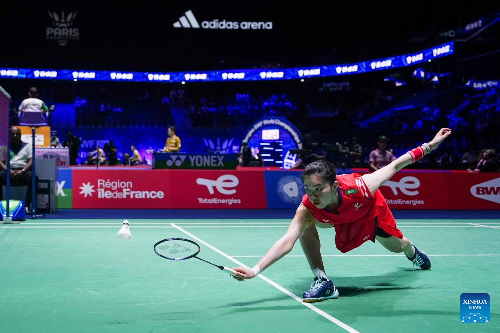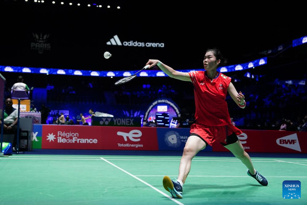 Gao Fangjie hits a return during the women's singles first round match between Gao Fangjie of China and Goh Jin Wei of Malaysia at the BWF World Championships 2025 in Paris, France, Aug. 26, 2025. (Xinhua/Peng Ziyang)