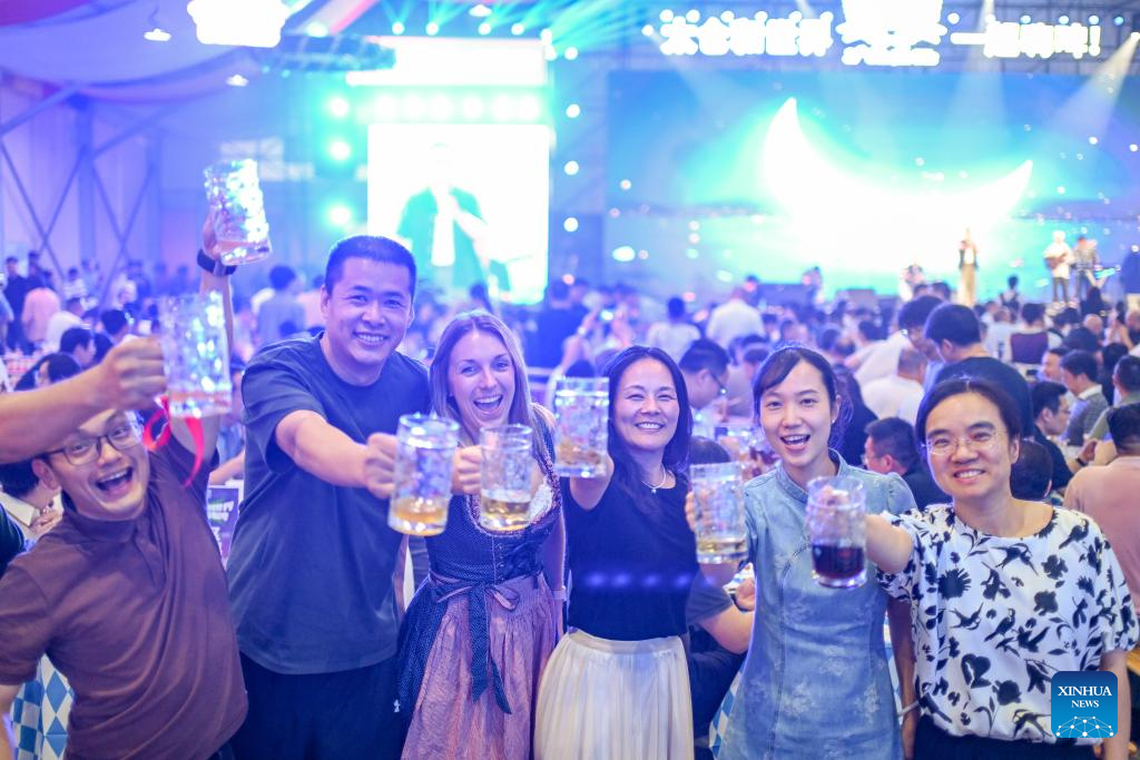 People pose for photos at the 20th Taicang Rothenburg beer festival in Taicang City, east China's Jiangsu Province, Aug. 26, 2025.