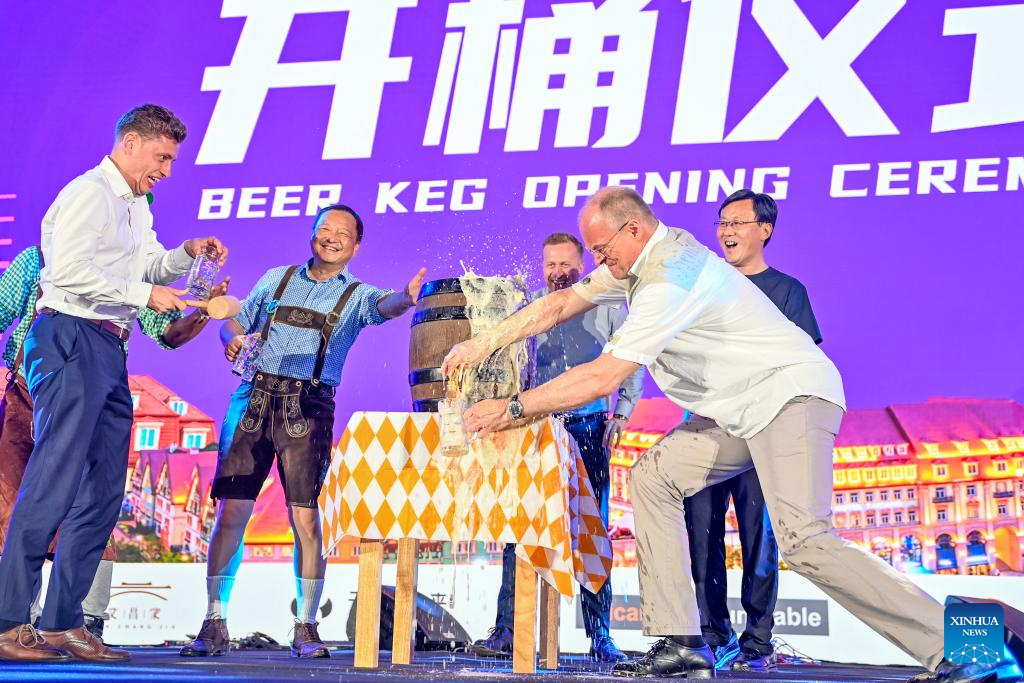 Guests attend the opening ceremony of the 20th Taicang Rothenburg beer festival in Taicang City, east China's Jiangsu Province, Aug. 26, 2025.