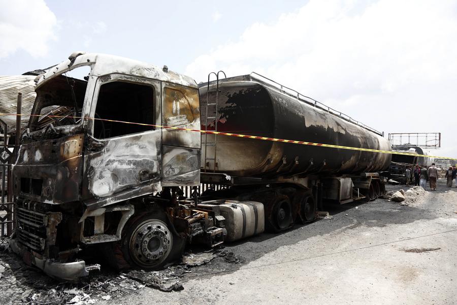 A destroyed oil tanker is seen after it was struck by Israeli airstrikes on Sunday, in Sanaa, Yemen, Aug. 25, 2025. (Photo by Mohammed Mohammed/Xinhua)