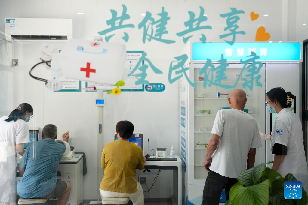 Villagers are pictured at a smart clinic of Kuangting Village in Anhua Town, Zhuji City, east China's Zhejiang Province, Aug. 26, 2025. In recent years, Anhua Town has focused on building an integrated medical and elderly care service network, with public health services covering all scenarios of the elderly's life.