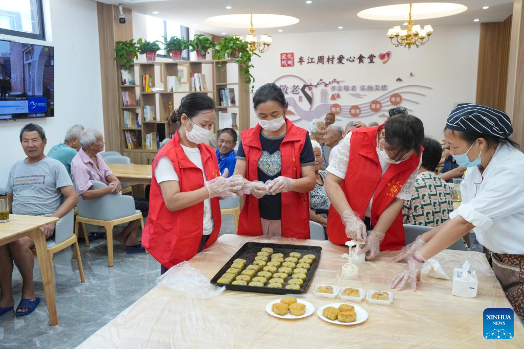 Volunteers make medicinal herb mooncakes to the elderly at a canteen of Fengjiangzhou Village in Anhua Town, Zhuji City, east China's Zhejiang Province, Aug. 26, 2025. In recent years, Anhua Town has focused on building an integrated medical and elderly care service network, with public health services covering all scenarios of the elderly's life.