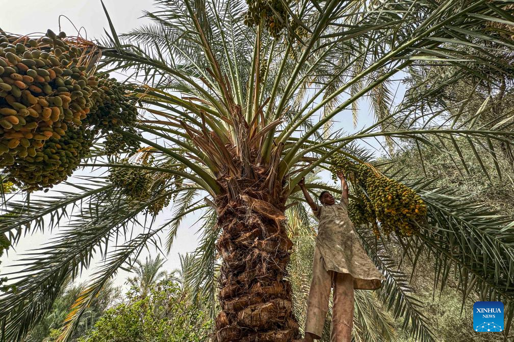 A farmer picks dates at Dahshur village in Giza, Egypt, Aug. 26, 2025. (Xinhua/Ahmed Gomaa)
